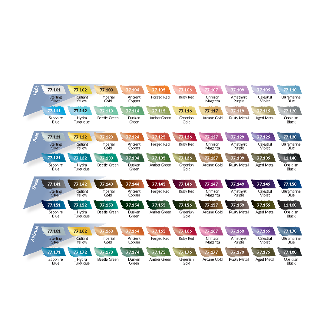 Cette mallette contient les 80 couleurs de la gamme True Metallic Metal, organisées en 20 familles chromatiques, pour chaque teinte TMM, 1 base version pinceau et aérographe, 1 Shade et 1 Light, le système complet BSL Base Shadow Light) appliqué au métal.